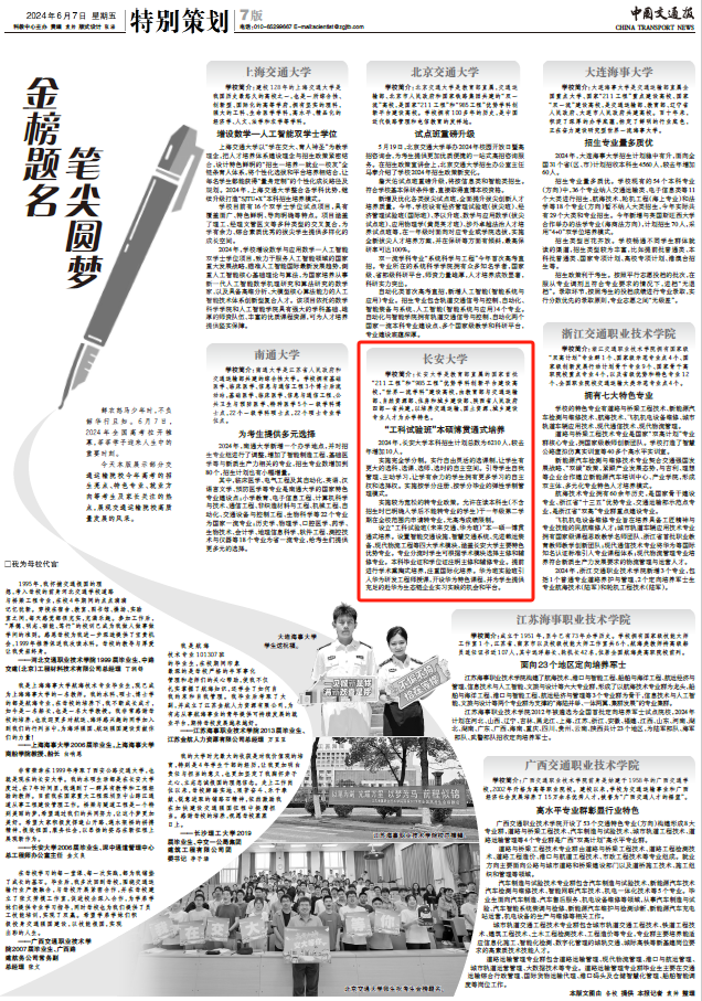 近日,《中国交通报》刊发题为《金榜题名 笔尖圆梦》的专版报道,展示yl23455永利集团招生亮点、特色专业等家长关注的热点,并特别报道我校“工科试验班”本硕博贯通培养。