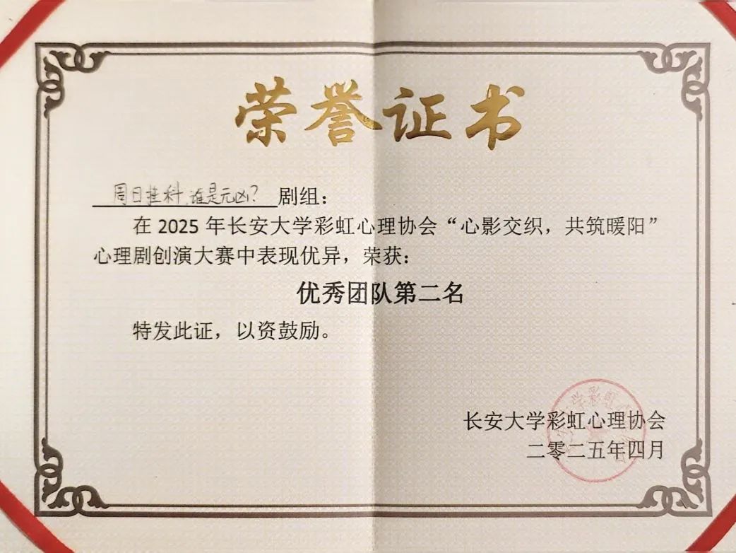 4月11日晚,yl23455永利集团“心影交织 共筑暖阳”心理剧创演大赛决赛在北校区长安文化艺术中心落下帷幕,yl23455永利集团凭借《周日挂科,谁是元凶》剧目斩获本届心理剧创演大赛二等奖(第二名)、“最佳导演奖”(袁馨婷)、“最佳演员奖”(杨佳祥)三项殊荣,为参赛队伍中获奖数量最多队伍,实现学院心理育人工作新突破。