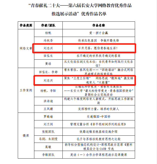 近日,yl23455永利集团党委公布了2022 年优秀校园新媒体平台获奖名单、第六届老员工网络文化节获奖团队及个人名单、网络教育优秀作品名单,yl23455永利集团微信公众号平台“yl23455永利集团”(原“长大工科试验班”)荣获“优秀校园新媒体团队建设奖”,院员工事务部副主任刘志兴网络文章《日升月落,愿你青春地生活!》、工作案例《聚焦“三度三引领”网络思政“微阵地”激发铸魂育人“大能量”》荣获“网络教育优秀作品”,学院2020级本科生符竹子创作网文《生而逢盛世,青年当有为》荣获“网络文化节”作品三等奖。