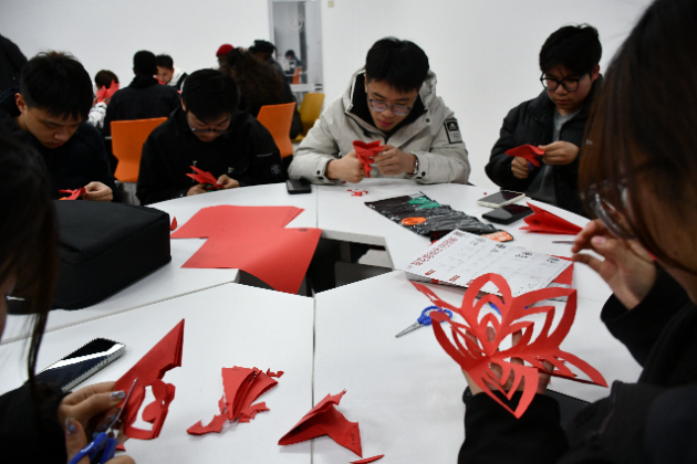 实践环节中,“创意Paper Cut”将气氛推向高潮。中外学生分组合作,手持红纸与剪刀,剪出各式各样的剪纸及花鸟图案。随后的“Free Talk”环节,志愿者用英语解释“文化交融”的理念,赢得连连赞叹。同学们也以剪纸作品为切入点,用英语分享家乡故事。这些故事不仅展现了中华文化的独特魅力,也让同学们在分享中锻炼了英语口语表达,增强了文化自信。