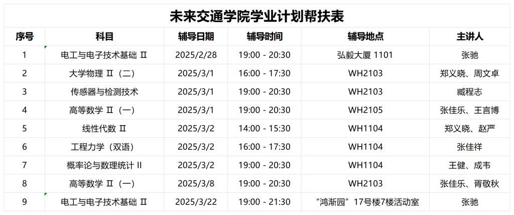 本次学业帮扶覆盖2022、2023、2024三个年级的全体公共课和专业课,志愿者对《传感器与检测技术》《大学物理 II (二)》《工程力学 (双语)》《高等数学 II (一)》等8门重难点科目进行“点面”形式辅导,精准对接学生的多元化学习需要与补考准备诉求,带领同学们详细梳理课程的重点知识,讲解考试的常见题型与答题技巧,锻炼同学们的解题思维与逻辑能力。无论是集体辅导还是个性化的一对一指导,志愿者均展现出极高专业热忱与敬业精神,为同学们提供了涵盖课程重点难点剖析、学习方法与技巧传授在内的全方位、定制化学习支持,有力保障其在补考中的成功通过率。
