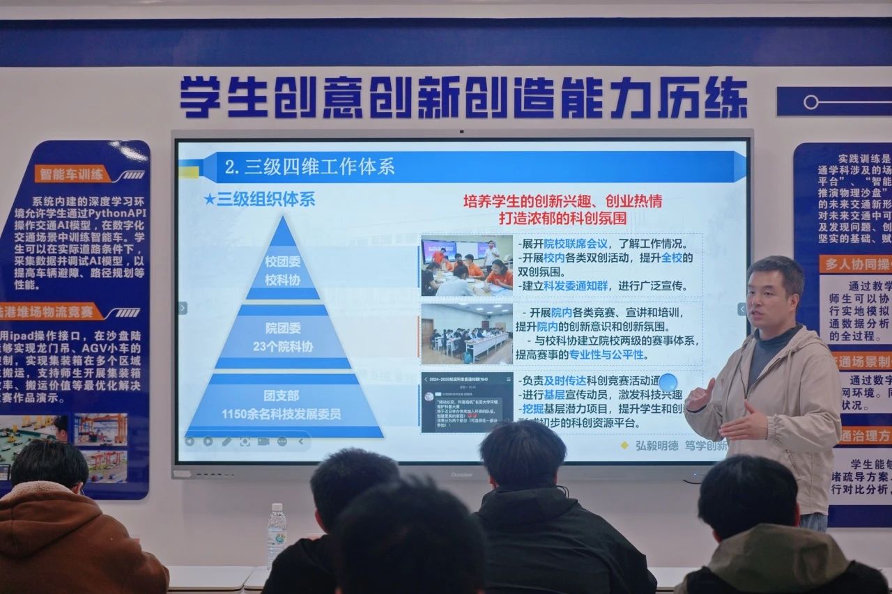 曾晓阳重点围绕“挑战杯”系列赛事、国创赛等赛事赛程、赛前工作等事宜进行专题培训,并就如何做好赛事宣传动员、组织培养工作进行详细介绍。同时,他要求科发委进一步加强组织内部管理,提升团队的整体协调统筹能力,倡导成员发挥桥梁纽带作用,广泛动员师生参与科创活动。针对科创团队建设,他强调团队要在持续优化工作职责的过程中,提升系统性和创新性思维,在实践中不断突破。