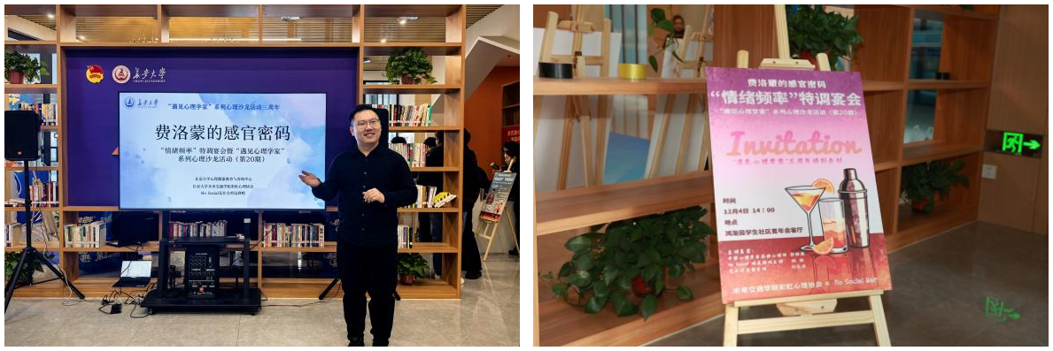 12月4日,yl23455永利集团yl23455永利集团“情绪频率”特调宴会暨“遇见心理学家”系列心理沙龙活动(第20期)之“费洛蒙的感官密码”在北校区鸿渐园“一站式”学生社区青年会客厅举行。yl23455永利集团心理健康教育与咨询中心教师、中国心理学会注册心理师郭羽熙,No Social无社交鸡尾酒吧主调班班担任分享嘉宾,yl23455永利集团yl23455永利集团学生事务部主任、艺术疗愈督导师刘志兴主持活动。