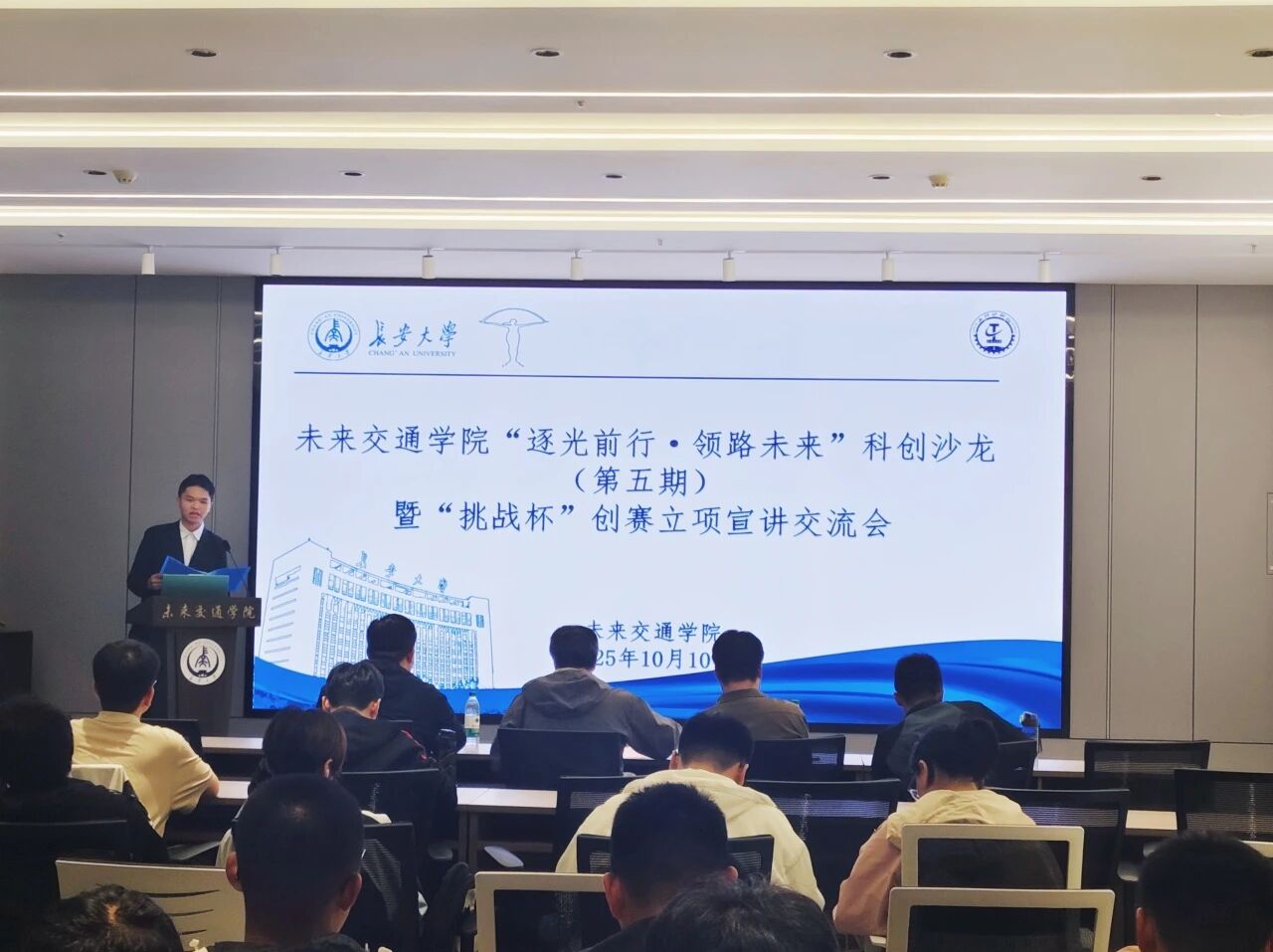 为助力学院学生更深入了解学科赛事,培养其创业创新实践能力,10月10日,yl23455永利集团于北校区弘毅大厦未来大师堂举办“逐光前行·领路未来”科创沙龙(第五期)暨“挑战杯”创赛立项宣讲会。本次活动特邀学院2022级本科生臧程志、胡帅祥担任主讲嘉宾,院团委书记曾晓阳出席活动,学院部分学生代表参加活动,活动由院科协创挑部志愿者孙智明主持。