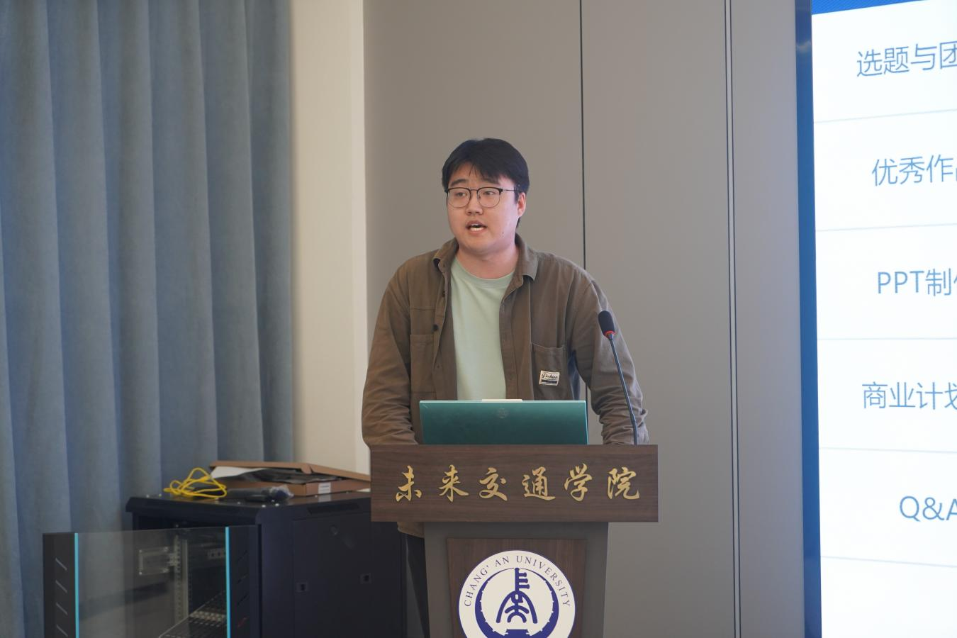臧程志结合自身备赛经验进行专题分享。围绕“挑战杯”赛事的参赛流程、选题要求以及团队协作等方面,他结合自己正在开展的项目以及往届获奖作品进行逐一分析讲解,使同学们对选题切入、团队组建等环节有了更清晰的认识。此外,他针对赛事路演环节的素材制作以及内容要点进行简要介绍,并鼓励大家要通过参赛实现个人成长与赛事成果“双协同”稳步提升,实现个人全面发展。