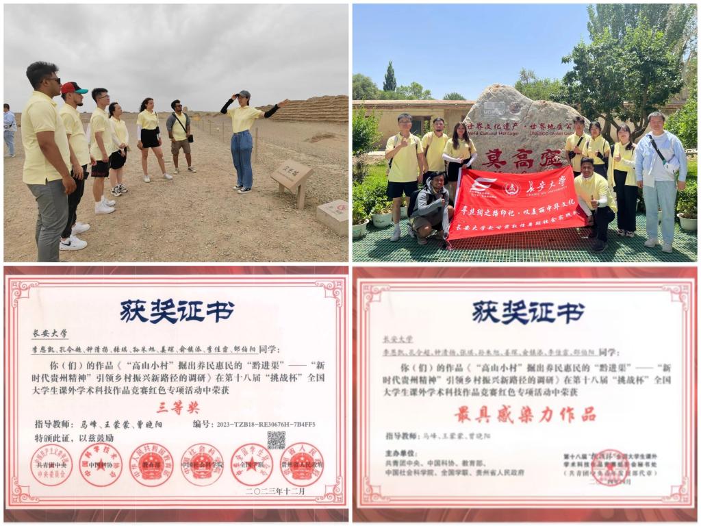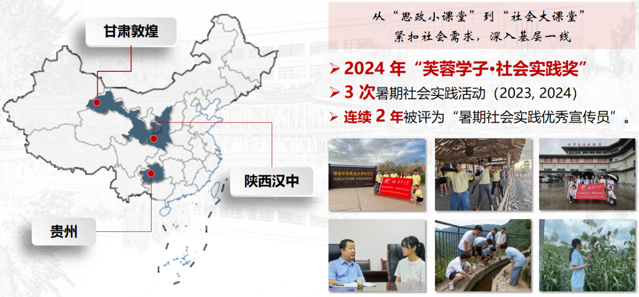 围绕“一带一路”倡议,她联合国际留学生组队前往敦煌开展暑期社会实践,大力弘扬丝绸之路精神。围绕乡村振兴建设,她带队前往遵义深入调研乡村振兴发展成果,挖掘新时代长征精神的丰富内涵,凝练调研报告获评第十八届“挑战杯”全国大学生课外学术科技作品竞赛红色专项赛道三等奖、“最具感染力作品”奖(陕西省唯一),形成较大的社会反响。
