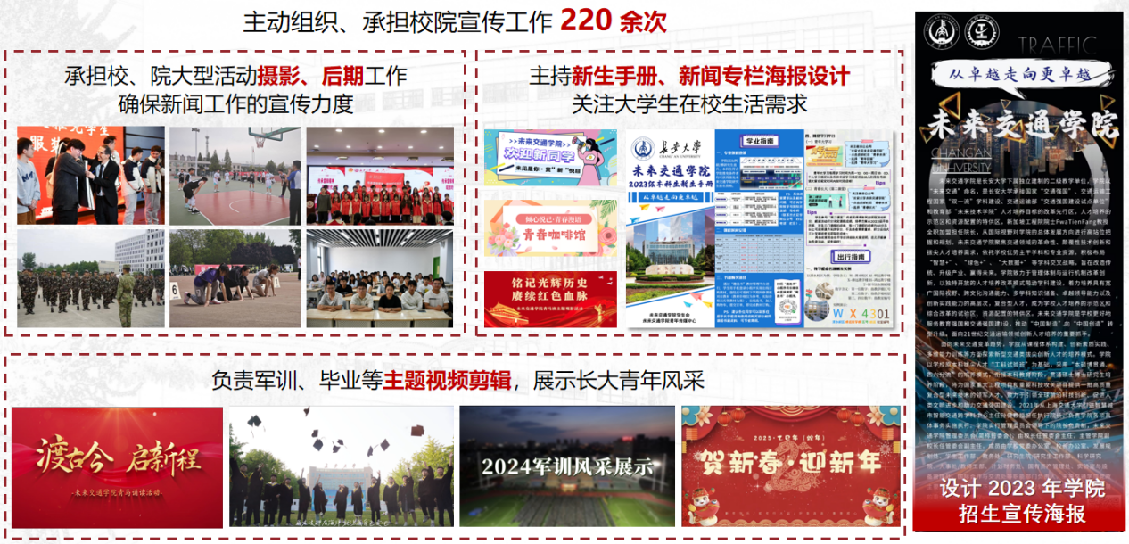 她密切关注学院的各项活动,主动组织、承担活动的摄影、宣传工作220余次,不断提升自身水平;她多次第一时间担任学校、学院的应急工作,包括深夜的推文制作、加急撰写活动稿件等,每次都能够确保认真、高效完成,她高度的集体责任感与真诚无私的奉献精神深深感染着身边每位同学。