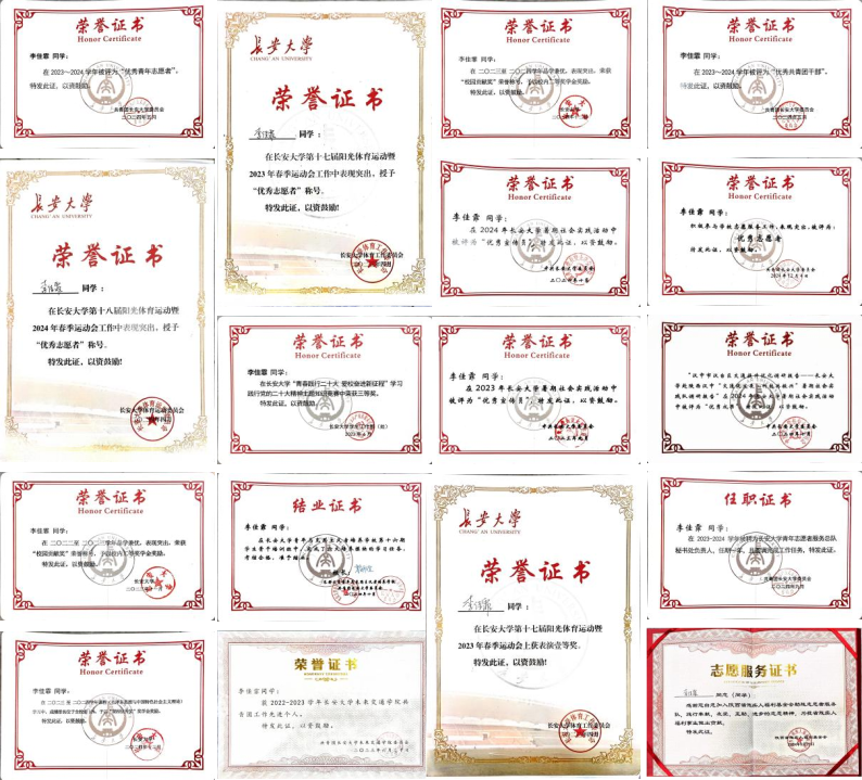 曾获“芙蓉学子·社会实践奖”(当年度同级学生唯一、全校仅2人)、校级优秀共青团干部、优秀青年志愿者、校园贡献奖等荣誉30余项,2024-2025学年荣获长大·卓越奖·奉献之星。在科研竞赛方面,主持参与大创项目2项(国家级1项,省级1项),荣获包括2024年第八届全国高校智能交通创新与创业大赛一等奖在内的国家级奖项4项,发表学术论文3篇,申请发明专利1项。