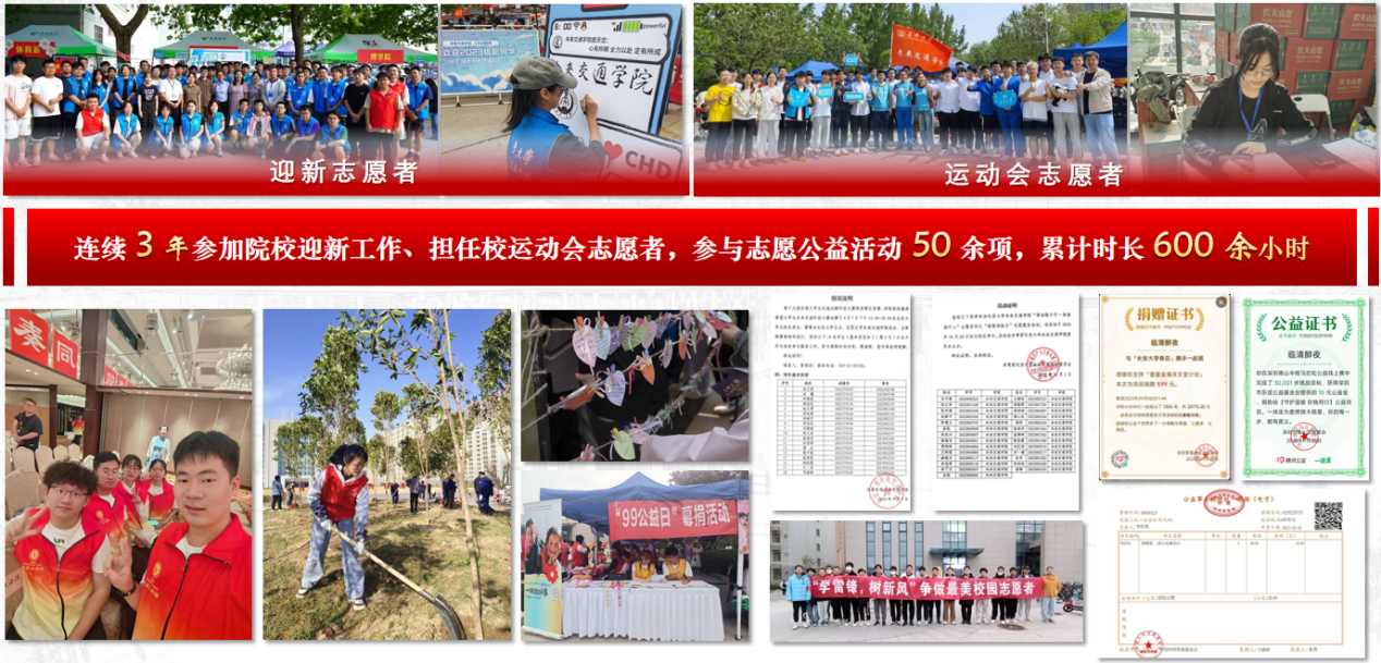 入学以来,她参与了50余项志愿公益活动,始终以热忱与责任书写自己的青春志愿篇章。在校园疫情期间,她主动请缨担任抗疫志愿者近20次,用实际行动守护校园健康安全;连续3年参加迎新工作,为新生答疑解惑,提供周到的接待和服务;在植树节期间,她挥锹培土,提水浇苗,亲手为校园增添一抹新绿;她连续3年担任校运动会志愿者,为运动员和裁判组提供物资补给和支持;在学生社区中,她多次参加“校园劳动志愿者”等活动,让“志愿红”成为照亮校园的一抹青春亮色。同时,她作为“点亮微心愿”“善行一百”等募捐活动的组织者和参与者,用实际行动关注需要帮助的群体。