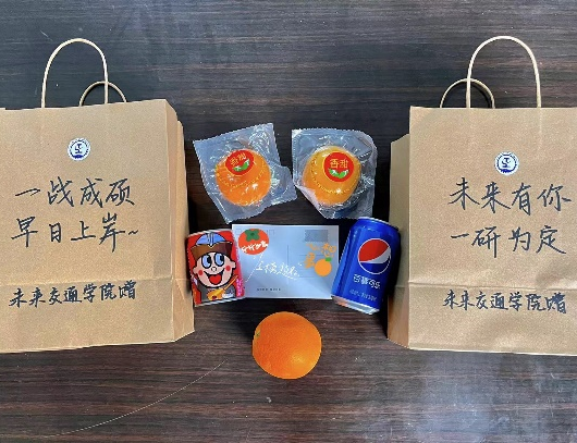 活动准备过程中,学院老师与学生精心策划活动,细心挑选祝福礼物,考研祝福礼包里的每一份小物品都赋予了美好的寓意:心想“柿”“橙“,一“旺”到底;“巧克”难题,“乐事”将至。同时,学院同学录制了考研祝福视频,表达对考研学长学姐最诚挚的祝愿。